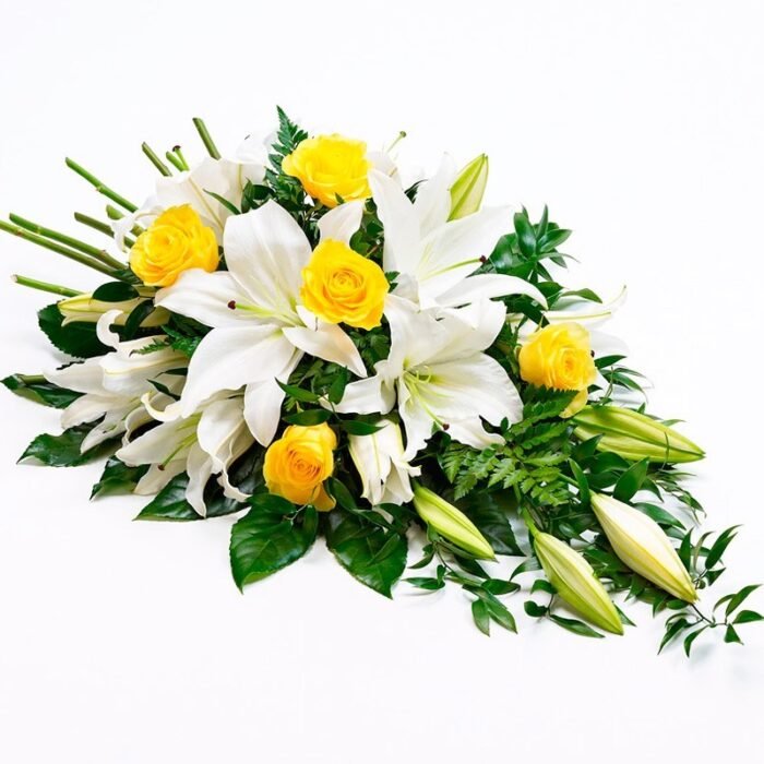 Un tributo floral que combina la calidez de las rosas amarillas con la pureza y solemnidad de los liliums blancos. Este arreglo, diseñado para honrar la memoria de un ser querido, busca transmitir un mensaje de luz y consuelo en un momento de duelo.