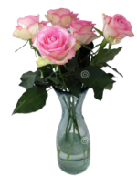Este bello florero de vidrio contiene 6 rosas rosadas frescas, acompañadas de follaje de temporada que realza su belleza natural y aporta un toque de frescura. Un arreglo delicado y lleno de encanto, perfecto para expresar cariño, gratitud o simplemente para alegrar cualquier espacio con un detalle sutil y elegante.
