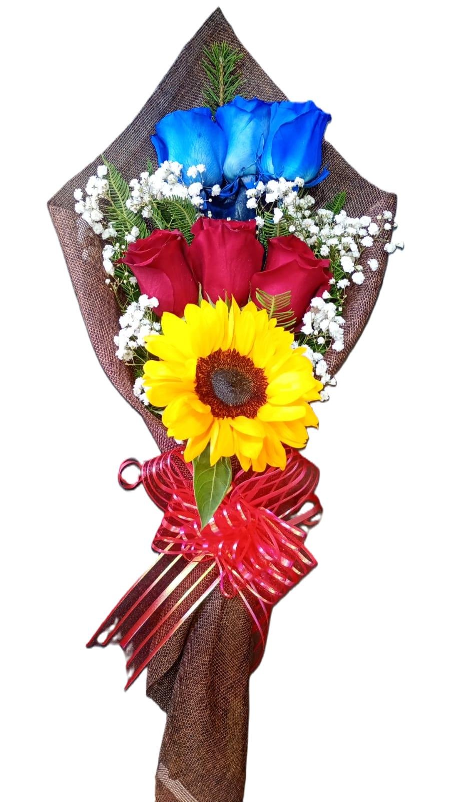 La combinación de colores crea un contraste llamativo y equilibrado: la intensidad del rojo, la originalidad del azul y la luz del girasol se unen en un ramo ideal para regalar en cumpleaños, aniversarios, celebraciones especiales o simplemente para sorprender a alguien importante.